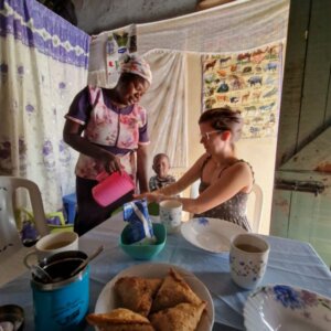 Heute Morgen hatte uns Ruth, unsere „Kochmutti“ und liebevolle Freundin, zu meinem letzten Frühstück in Nyabondo zu sich nach Hause eingeladen. Frisch auf dem Holzkohleofen frittierte Teigtaschen mit Linsenfüllung und der typische kenianische Tee mit Milch und Ingwer standen auf dem Tisch bereit. Gloria, Ruths jüngste Tochter, hatte ihren eigenen kleinen Tisch.