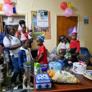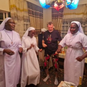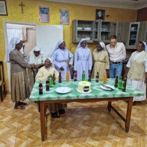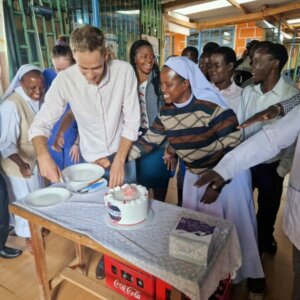 Und dann begann die Party im Gästehaus, welches die Sisters romantisch mit Kerzenlicht und Musikanlage gerichtet hatten. Nach einem gemeinsamen leckeren Dinner ging es in das gemütliche Wohnzimmer des Hauses. Die Sisters wollten sich bei mir für die Arbeit bedanken und Anna-Lena und Claudia herzlich begrüßen. Mein Abschiedsgeschenk musste ich gleich anziehen, jetzt kann ich mich im Sommer kenianisch kleiden, ich habe mich sehr gefreut. Die extra für uns beschrifteten Kuchen mussten wir dann selber aufschneiden, ein typisch kenianischer Ritus mit passender Musik. Dazu gab es „Champagner“ aus Südafrika, und die Sisters zeigten, dass sie durchaus Spaß an der Freude haben und ausgelassen feiern und tanzen können. Ein unglaublich schöner Abend, der so ausschweifend war, dass die Sisters beschlossen, das „morning prayer“ (Morgengebet) um eine halbe Stunde nach hinten zu verschieben. Ein toller, eindrucksvoller Tag ging zu Ende.