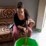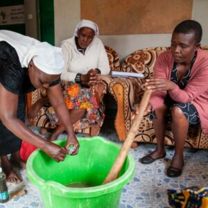 Lena und Sophie lernten heute Nachmittag in der Witwenkooperative, wie man flüssige Seife herstellt. Und wie die Perlenbänder gemacht werden. Die Seife stellen die Frauen zweimal die Woche her, teils zum Eigengebrauch, teils zum Verkauf auf regionalen Märkten. Für die Seife werden verschiedene Chemikalien, wie Glycerin und spezielle Salze mit Duft- und Farbstoffen in einem riesigen Eimer mittels Holzlöffel lange gerührt und anschließend für 24 Stunden stehen gelassen. Danach wird die Seife in kleine Plastikflaschen abgefüllt und verkauft.
