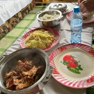 Danach gab es Sonntagsfrühstück mit Ruth. Betty von der Zahnstation holte uns später ab, um uns auch ihr Haus und ihre Familie zu zeigen. Hühner, Gemüse, Früchte, alles gehört zu ihrem Leben in einem bescheidenen Haus. Sie ließ es sich nicht nehmen, uns ein Lunch zuzubereiten mit Kohlgemüse, Reis und Chicken aus ihrem Garten. Wieder ein tiefer Einblick in die Gepflogenheiten der hiesigen Bevölkerung. Zum Schluss gab sie uns noch Bananen und Früchte mit, wir sind gut versorgt.
