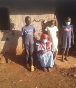 “Dani“ (Oma in der Stammessprache der Luo), kräht der kleine James und greift nach der Hand seiner Großmutter Leonida. Die tastet nach seinem Kopf und legt ihre Hand auf seine kleine Schulter. Ihr Blick ist dabei nach vorne gerichtet, die Augen sind trüb. Die 75-jährige Leonida ist blind. Sie sitzt auf einem Armstuhl in ihrer kleinen Lehmhütte in Kibuon. Ihre drei Enkel James (3), Steven (5) und Gerald (7) sitzen neben ihr auf Wasserkanistern. Die Kinder sind Halbwaisen, seitdem ihr Vater vor drei Jahren starb. Leonida weiß nur, dass er unter sehr starken Kopfschmerzen litt, aber eine Diagnose gab es nicht. Ihre Schwiegertochter Monica verrichtet tagsüber Feldarbeit. Sie verlässt morgens das Haus, bevor es hell wird und kommt oft erst am Abend nach Hause. Ihr Gehalt ist alles, wovon die kleine Familie lebt. Vor der Corona-Pandemie hat Leonida mit Betteln auf dem Markt noch etwas dazu verdienen können. Das ist nun wegen der strengen Covid-Richtlinien nicht mehr möglich.