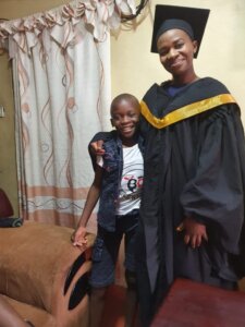 Winnie suchte ihr Büro auf und erzählte der Franziskaner-Nonne ihre Geschichte. Schwester Seraphine setzte sich dafür ein, dass DfA Winnie unterstützt. Drei Jahre nach der Geburt ihres Kindes konnte Winnie ihren Bildungsweg wieder aufnehmen. Inzwischen hat Winnie die Schule erfolgreich abgeschlossen. Mehr noch: Sie konnte einen Bachelor in Internationale Beziehungen und Geschichte abschließen.